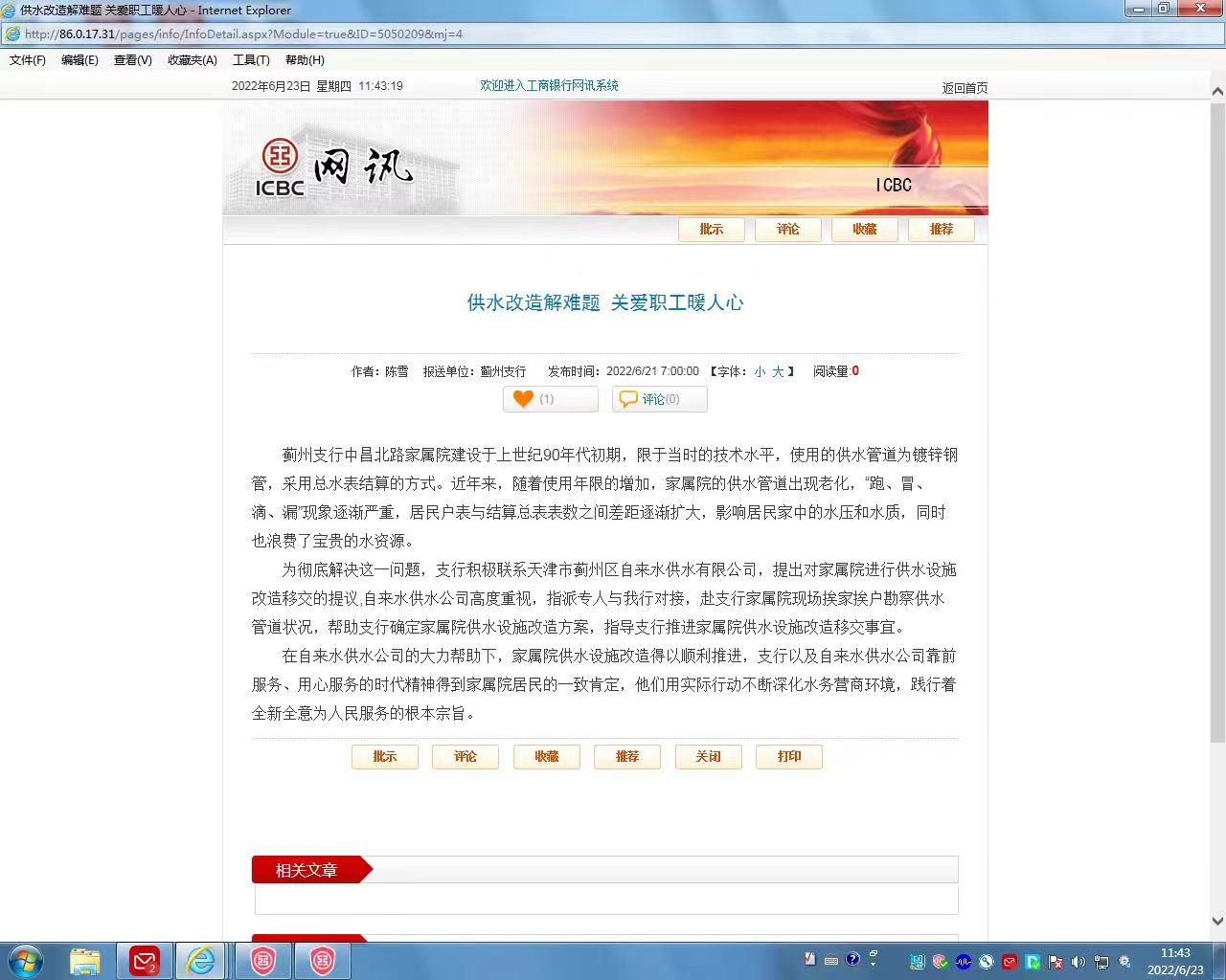 為徹底解決工行家屬院的供水問題,工商銀行天津市薊州區支行聯系我公司提出對家屬院進行供水設施改造移交的提議。我公司高度重視,立即指派專人與工行對接,向工行工作人員耐心講解相關政策及辦理流程。主動赴工行家屬院現場挨家挨戶勘察供水管道狀況,幫助工行確定家屬院供水設施改造方案,指導工行推進家屬院供水設施改造移交事宜,使工行天津薊州區支行家屬院改造實現了“零資料”和“零跑腿”,用實際行動踐行全心全意為人民服務的宗旨,獲得了工商銀行的認可。工商銀行于2022年6月21日在工商銀行網訊系統以“供水改造解難題 關愛職工暖人心”為題對該家屬院改造的相關情況進行了刊登報道。