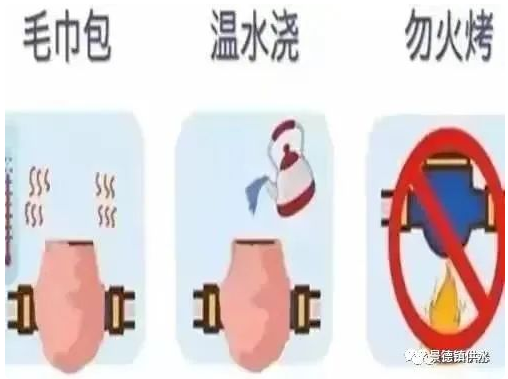 1、對已凍住的水龍頭、閥門、水管,用戶可以用熱毛巾裹住水龍頭,然后澆灑溫水,使水龍頭解凍再擰開水龍頭,用溫水沿水龍頭慢慢向管子澆灑,使水管解凍。切忌用火燒烤或用開水激燙,這樣反而容易導(dǎo)致水管爆裂。 2、如果是家中水表受凍結(jié)冰,切忌用過熱的開水直接沖淋水表表面,應(yīng)使用不超過50攝氏度的溫水沖淋,切忌用火烘烤。如水表表面玻璃已經(jīng)凍裂,用戶要立即與天津市薊州區(qū)自來水供水有限公司聯(lián)系。